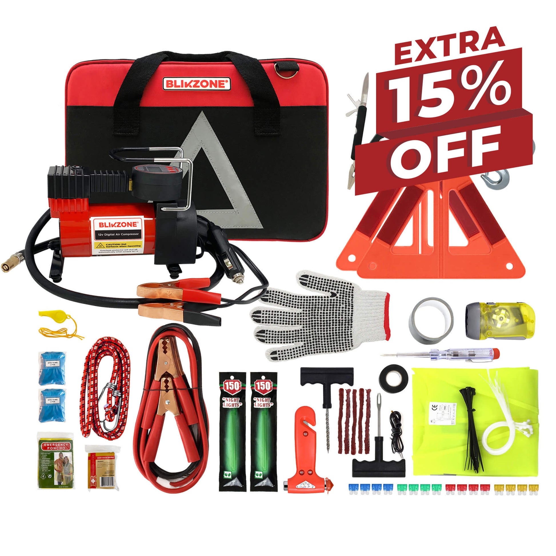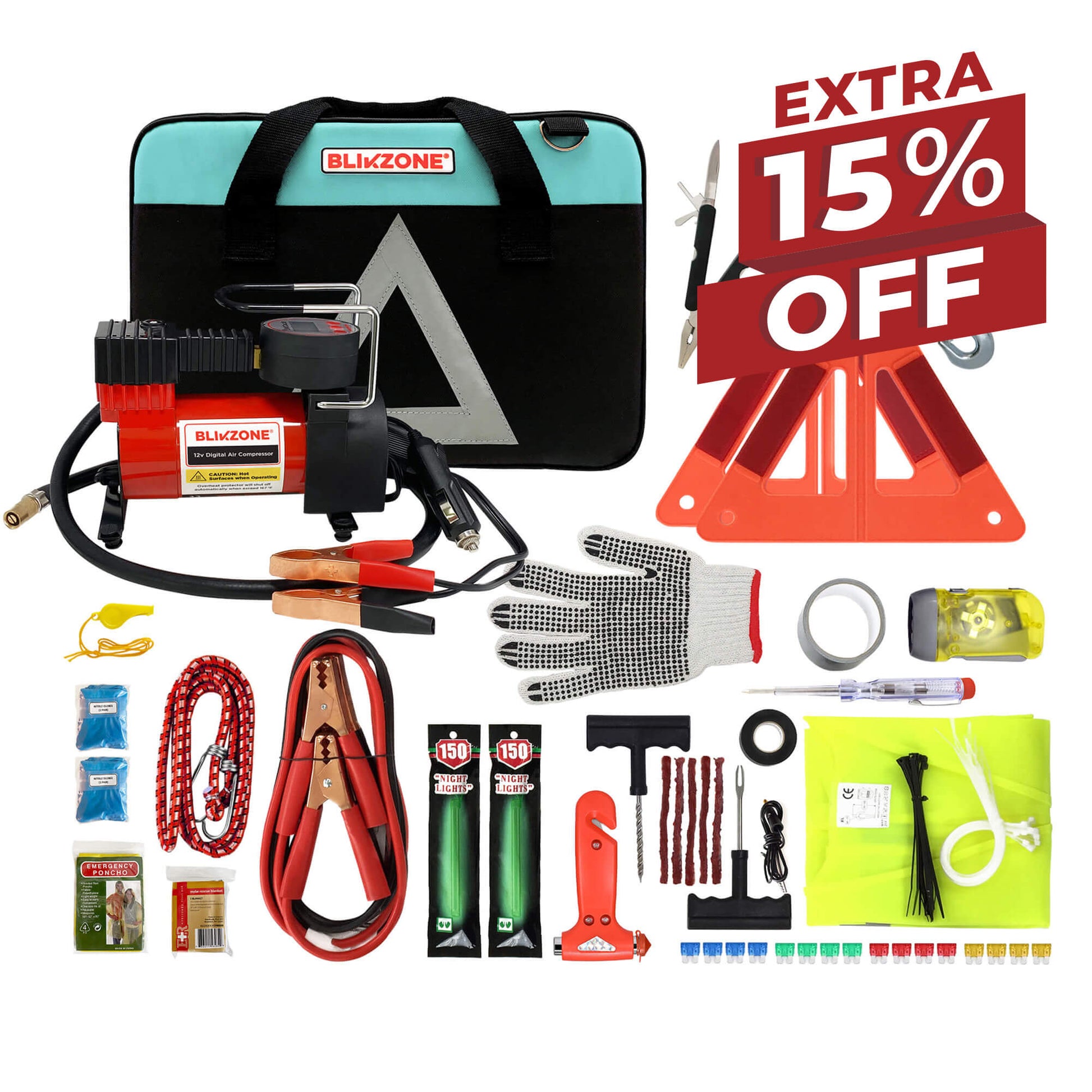 Blikzone Car Emergency Safety Kit with Digital Air Compressor for Car